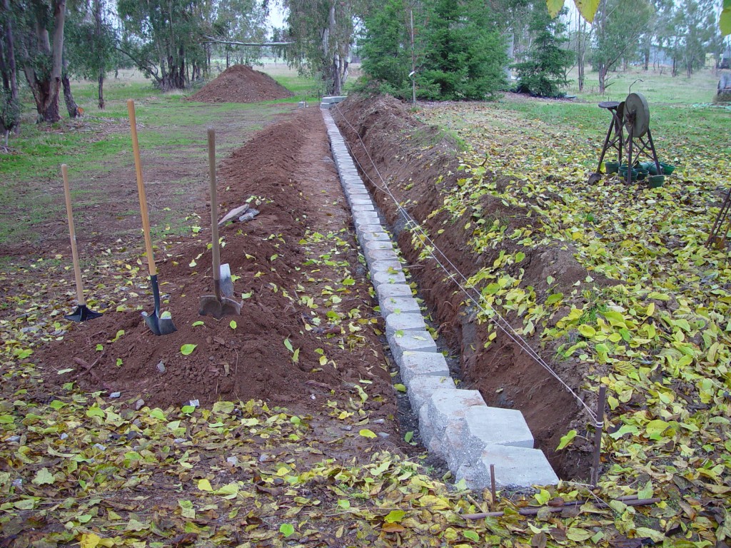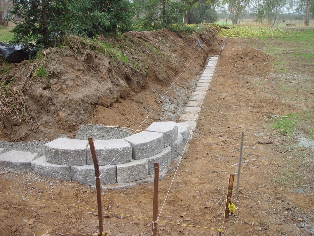 Supplies required: tractor, shovel, pickaxe, level, mallet, chisel, string line, gravel, 3″ perforated drain pipe wrapped in fabric and last but not least retaining wall block. These concrete blocks interlock and require no mortar; and are best for low level walls.